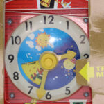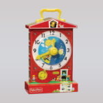 Introduced in 1968, the Fisher-Price Music Box Teaching Clock has made learning to tell time fun for generations of children. Designed as a little red school house, the Fisher-Price Classics Music Box Teaching Clock plays Grandfather’s Clock and has a rotating dial with timeless pictures of preschoolers hour by hour, as the clock face and minute hand revolve to the soothing ticking of time.